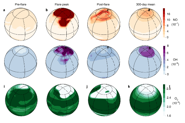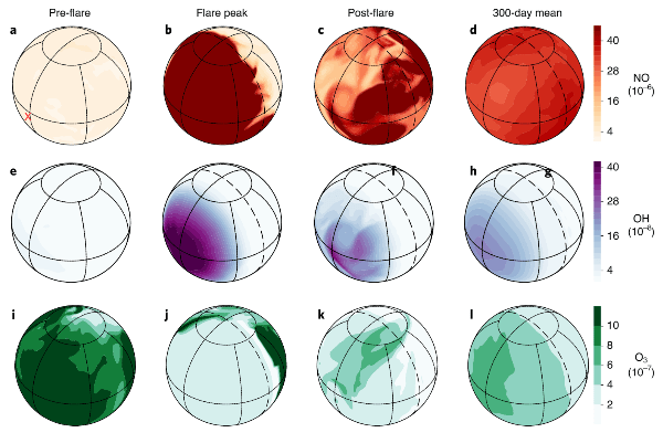 But only some. In other cases, their work showed that flaring can destroy potential biosignatures from anoxic life. "Although we report the 3D effects of stellar flares on oxidizing atmospheres, strong flares could have other unexpected impacts on atmospheres with reducing conditions. For instance, hydrogen oxide species derived from stellar flares could destroy key anoxic biosignatures such as methane, dimethyl sulfide and carbonyl sulfide61, thereby suppressing their spectroscopic features," the authors report.