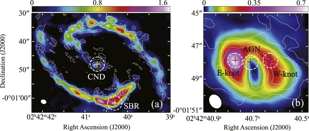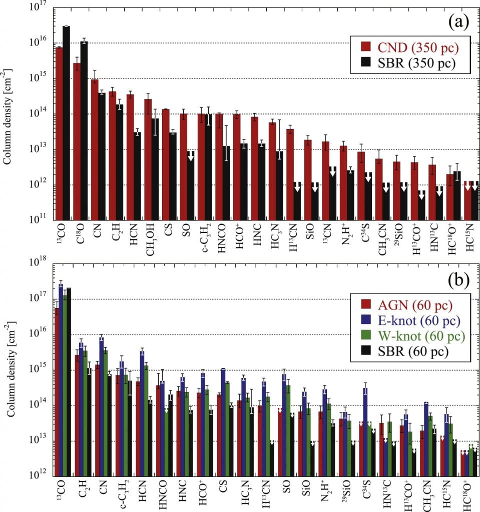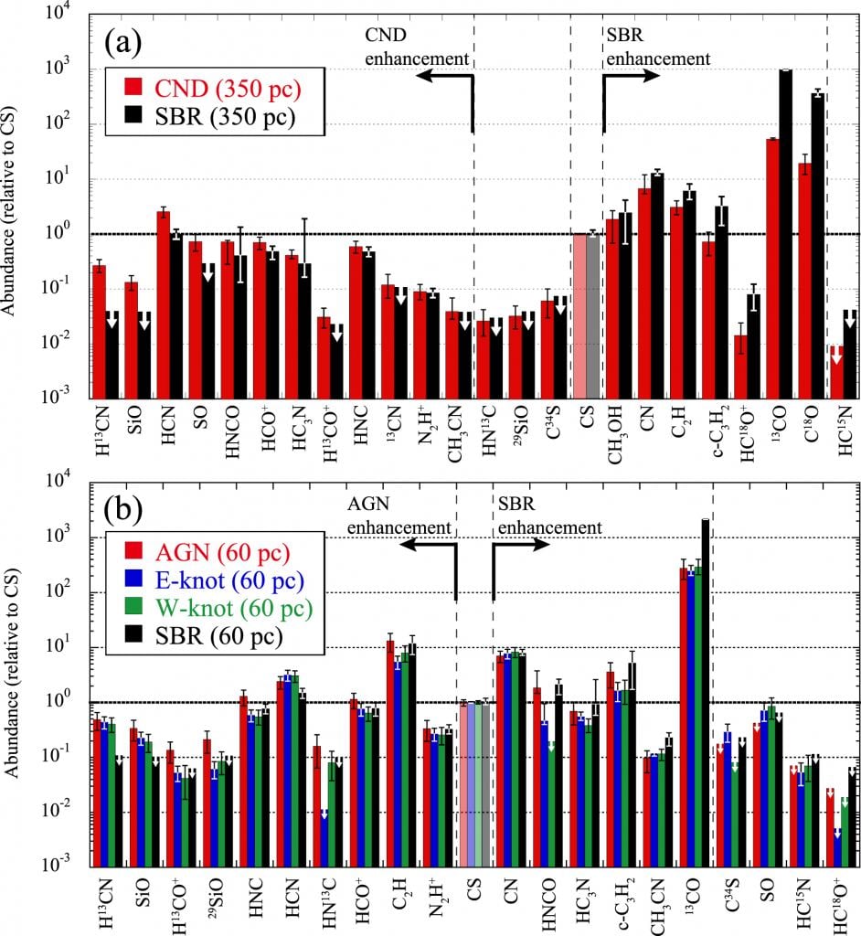The team also found unexpected concentrations of hydrogen cyanide (HCN) in the CND, which could be the result of strong shocks that create higher temperatures. The CND also contained more H13CN, SiO, and H13CO+. Conversely, the CND contained less cyanide (CN) than predicted by models, due to strong radiation. Even though the powerful AGN is much closer to the CND, the team thinks that mechanical forces have a stronger overall impact on the chemistry, rather than X-rays from the AGN.