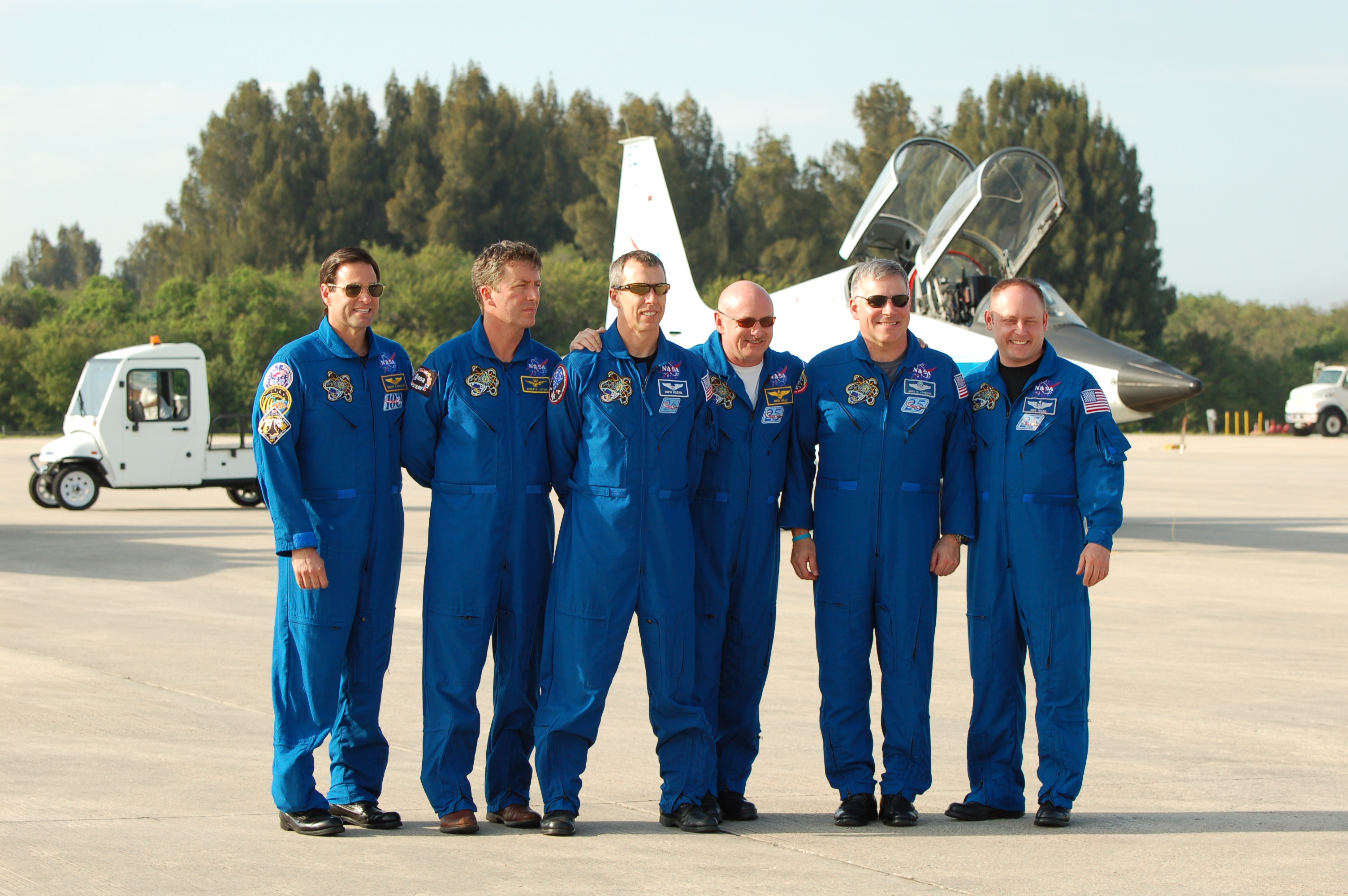 The crew for this mission consists of Kelly as the flight's commander, Pilot Greg Johnson and Mission Specialists, Mike Fincke, Greg Chamitoff, Andrew Feustel and ESA astronaut (but under the Italian Space Agency for this mission) Roberto Vittori.