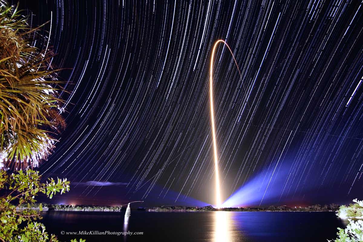 "I've wanted to attempt this shot for 2 years now & finally the conditions for it came together Thursday night - no moonlight, no clouds, barely a breeze, mostly dry air & enough TIME between sunset and liftoff to capture some descent star trails," Mike Killian told me.