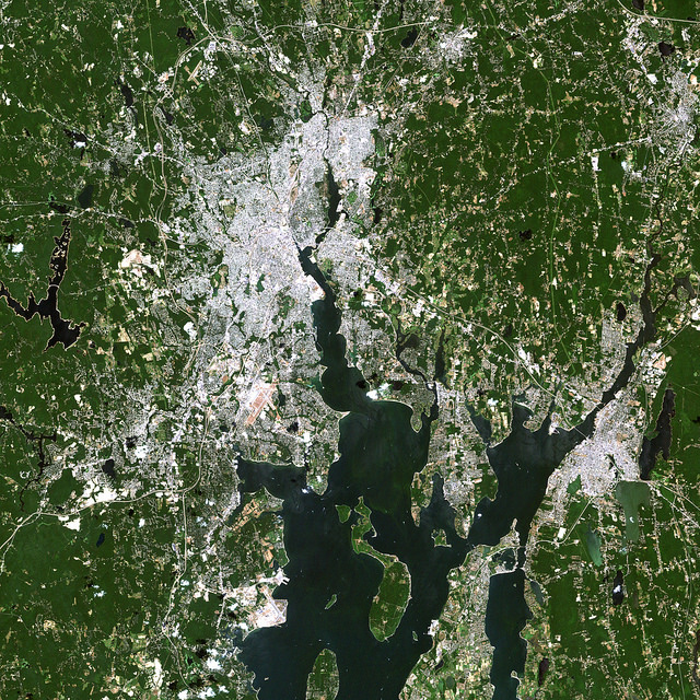 The image above shows the central and northern RI and southeastern Massachusetts area, with Providence and Pawtucket seen as the densely-built central region and Foxborough, MA, where the Patriots' home stadium is located, is just to the north of the image. This image was acquired by Landsat 7 in July 2002.