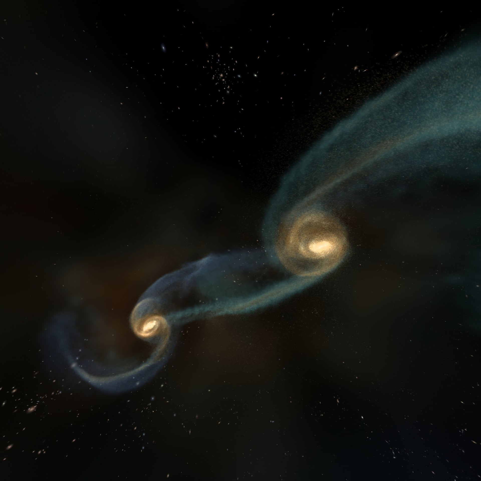 on May 10th, verifies something that has only been modelled in computer simulations. Models predict that as two fast-rotating black holes begin to merge, gravitational radiation is emitted through the colliding galaxies. As the waves are emitted mainly in one direction, the black holes are thought to recoil - much like the force that accompanies firing a rifle. The situation can also be