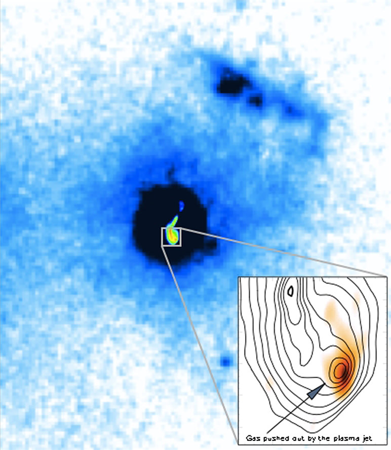 "With the finely-detailed images provided by an intercontinental combination of radio telescopes, we have been able to see massive clumps of cold gas being pushed away from the galaxy's center by the black-hole-powered jets," said Raffaella Morganti, of the Netherlands Institute for Radio Astronomy and the University of Groningen.