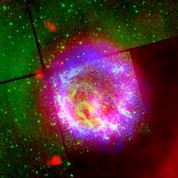 Thanks to 50 hours of observing with Spitzer's Infrared Array Camera (IRAC) and Multiband Imaging Photometer (MIPS), the S3MC survey team imaged the central portion of the galaxy in 2005. In one piece of that image, Stanimirovic noticed a red spherical bubble that she discovered corresponded exactly with a powerful X-ray source observed previously by NASA's Chandra X-ray Observatory satellite. The ball turned out to be a supernova remnant, 1E0102.2-7219, much studied during the past few years in the optical, X-ray and radio bands, but never before seen in the infrared.
