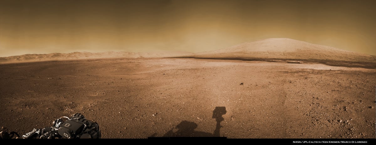 Image Caption: Panoramic Vista of Mount Sharp (at right) and Gale Crater from NASA's Curiosity rover on Mars. Curiosity will eventually climb 3.4 mile high Mount Sharp in search of hydrated minerals. This colorized panoramic mosaic shows more than half of the landing site surrounding Curiosity in the distance to the visible peak of Mount Sharp and a portion of the stowed robotic arm (at left) and the shadow of the camera mast (center) in the foreground. The mosaic was assembled from new navigation camera (Navcam) images snapped by Curiosity on Sol 2 and Sol 12 and colorized based on Mastcam imagery from Curiosity. Image stitching and processing by Ken Kremer and Marco Di Lorenzo. See black and white version below. Credit: NASA/JPL-Caltech/Ken Kremer/Marco Di Lorenzo