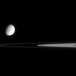 A couple of faint ringlets are visible in the Encke Gap, right of center. Tethys is 1,071 kilometers (665 miles) wide; Atlas is a mere 32 kilometers (20 miles) wide.