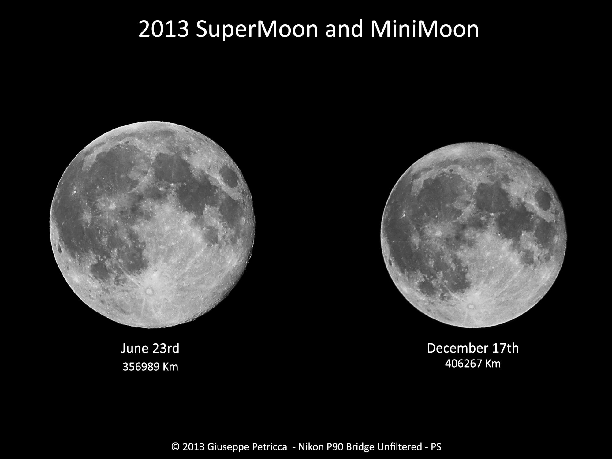 Astrophotographer Giuseppe Petricca from Pisa, Tuscany, Italy managed to capture two of the very 'special' full Moons from 2013 and created a comparative mosaic. Here is both the 2013 "SuperMoon" in June – when the Moon is the closest to Earth in its orbit and visually largest – and the recent December 2013 "MiniMoon" -- the most distant and visually smallest Full Moon of the year.