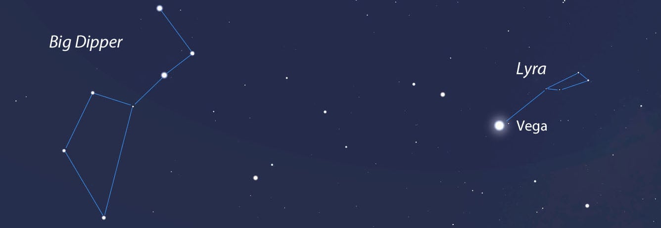 Take a look at the Big Dipper. Wow! It's totally bent out of shape yet still recognizable. The Pointer Stars no longer quite point to Polaris, but with some fudging we might make it work. Vega stands near the pole, and being much closer to us than the rest of Lyra's stars, has moved considerably farther north, stretching the outline of the constellation as if taffy.