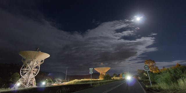 The Moon and Jupiter above the dishes in Canberra, Australia. Credit: .