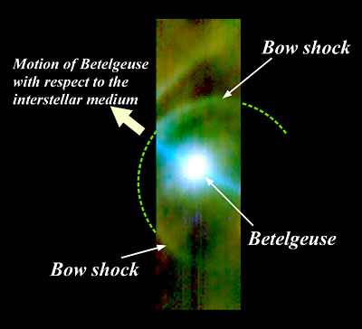 As Betelgeuse plows through the interstellar medium, the wind that it's spewing out at 17 km/sec (11 miles/sec) warms up the surrounding gas - which originates from star-forming regions in Orion's Belt - releasing light in the infrared. There is a rather strong current of interstellar gas in the area surrounding Betelegeuse, and just like the wave of water that is produced in front of a boat traveling over a lake, the dust and gas bunches up in front of Betelgeuse in the direction of travel.