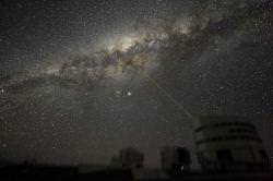 The beam stretching into the sky is part of the telescope's adaptive optics system. It creates an artificial star in the sky above the observatory, which a sophisticated computer can use to calculate the amount of atmospheric distortion above the telescope. The telescope's mirror is then distorted in real time to counteract the effects of the Earth's atmosphere. It's like having a space telescope without needing to actually head out into space.