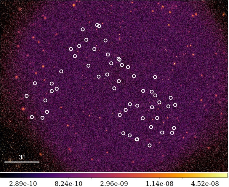 This Chandra image from the research shows the 55 LRDs in the Chandra Deep Field South in the 0.3 − 7 keV X-ray band. This range encompasses both soft X-rays and a good portion of the hard X-ray band. It's a broad and informative band for astrophysical observations, yet it turned up no X-ray detections. Image Credit: Sacchi and Bogdan, 2025, The Astrophysical Journal.