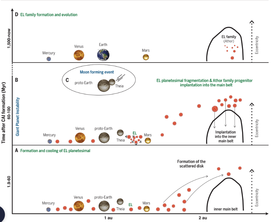 Enstatite achondrites that have struck Earth have similar compositions and isotope ratios as Earth. This signals that they formed in the same part of the protoplanetary disk around the young Sun. Previous research by Dr. Avdellidou and others has linked the meteorites to a population of fragments in the asteroid belt named Athor.