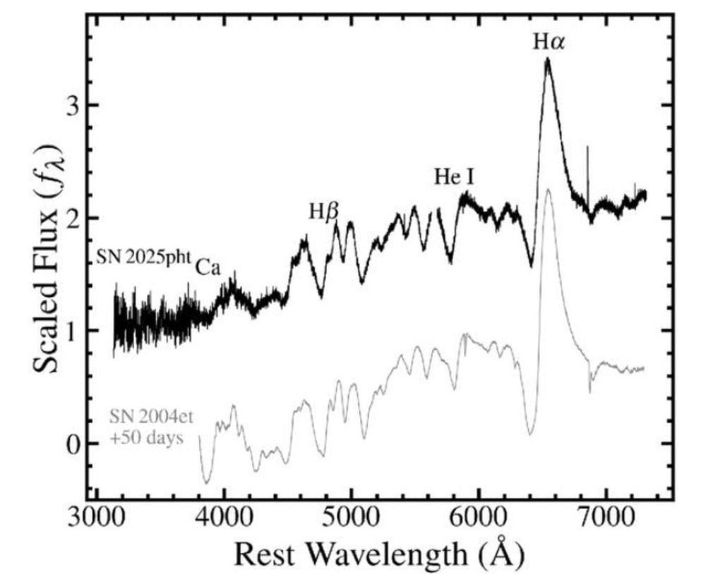 *This image shows the spectrum of SN 2025pht from Keck compared to that of a known supernova, SN 2004et. This helped confirm that what the astronomers were seeing was indeed a supernova. Image Credit: Kilpatrick et al. 2025. ApJL*