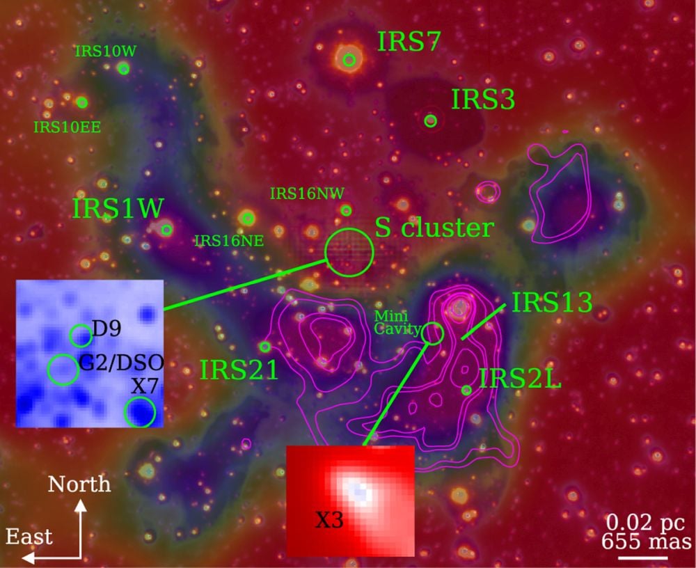*This image from the research is a multiwavelength finding chart of the inner ≈0.8 pc of the Galactic center. In callouts, it shows the three G-objects (blue) and the YSO X3 (red). Image Credit: Peißker et al. 2025. A&A*