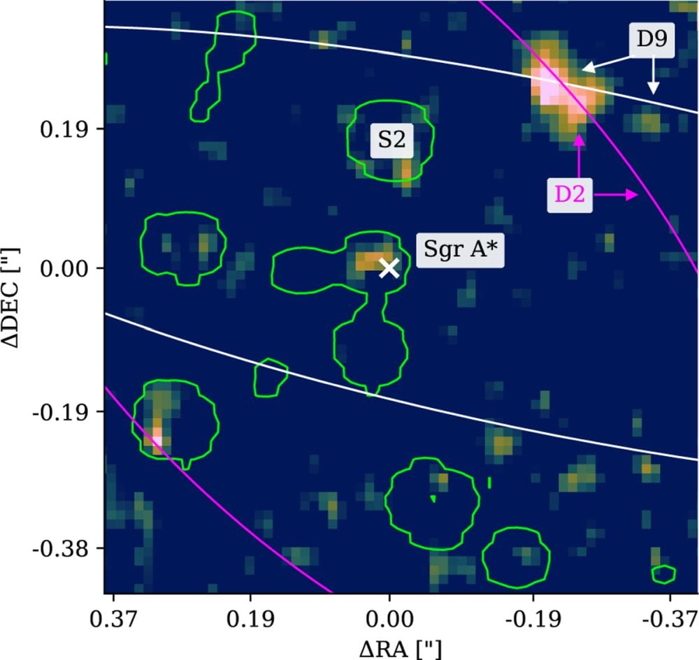 *This figure based on ERIS observations shows that the binary star D9 is also in its expected position. The fact that it's on a stable orbit is more evidence that the region near the SMBH isn't as destructive as thought. Image Credit: Peißker et al. 2025. A&A*
