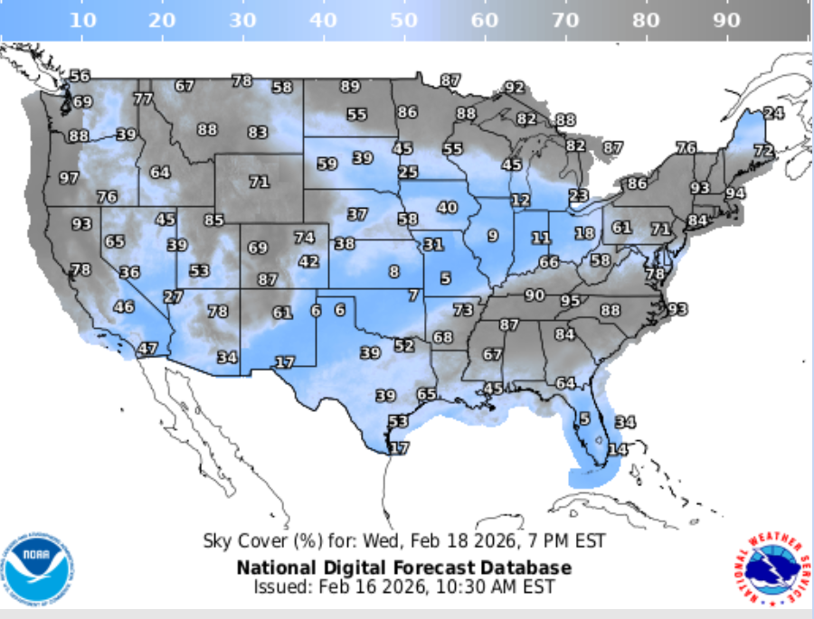 Cloud cover prospects for Wednesday night. Credit: NOAA.