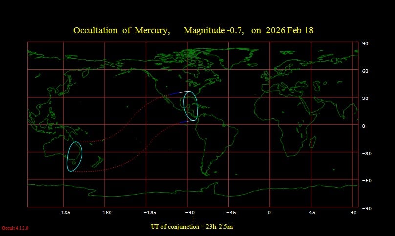 The real action begins on Wednesday night February 18th, when the Moon pairs with the innermost planet Mercury. This is a rare event, well-placed for viewers in the southeastern U.S., Mexico and Central America, the Gulf of Mexico and the Caribbean. Although the Moon occults Mercury several times a year, these usually occur close to the Sun or over a remote location worldwide.