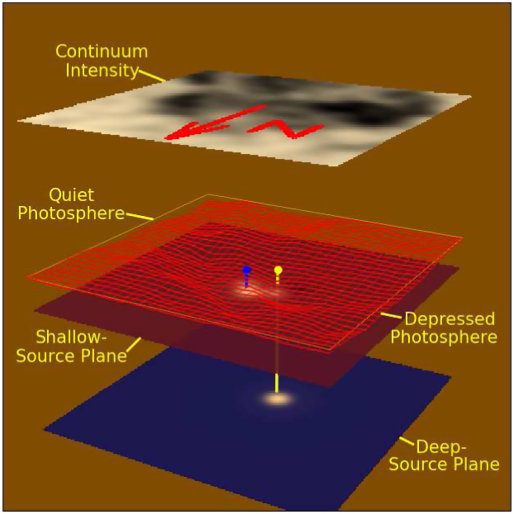 One of the Sun's mysteries is the nature of sunquakes, massive ripples traveling thousands of kilometers across the sun's surface. Occasionally, when a solar flare erupts, so-called seismic transients* can be seen rippling through the solar surface over the next hour. The energy source driving these ripples was thought to be either the transient heating of the solar atmosphere during the flare event or by the powerful flexing of magnetic flux applied directly to the photosphere (the sun's visible surface) itself, also originating in the flare event above. Using data from the Solar Dynamics Observatory (SDO), scientists have published a paper in the Astrophysical Journal of Letters that, for the first time, describes submerged* sources of transient acoustic emission (sunquakes). The source of these mysterious waves seems to be, as it turns out, a thousand kilometers deep below, in the churning, seething hot interior of the star.