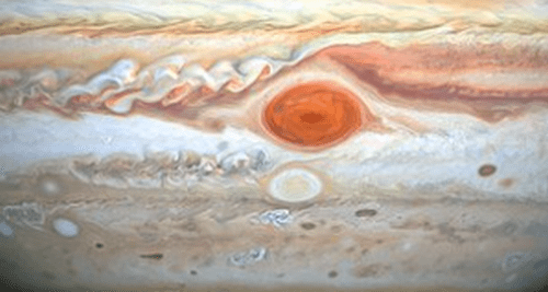 The GRS has a neighbour: the Oval BA, or Red Spot Junior. It's just below the GRS. Currently, Junior is fading to its original white-beige color, after turning red in 2006. Astronomers aren't certain why the spots appear red sometimes. Lab experiments showed that interactions between the Sun's ultraviolet light and atmospheric chemicals in the upper atmosphere produce reddish-brown [tholins](https://en.wikipedia.org/wiki/Tholin#:~:text=Tholins%20(after%20the%20Greek%20%CE%B8%CE%BF%CE%BB%CF%8C%CF%82,4)%20or%20ethane%20(C).