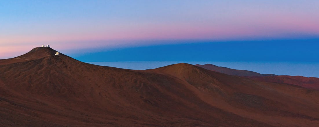telescope atop the peaks of the Cerro Paranal in Chile's Atacama Desert. In the distance the Earth's shadow extends outward toward the horizon, divided from the bluer daytime sky by the dusky pink "Belt of Venus."