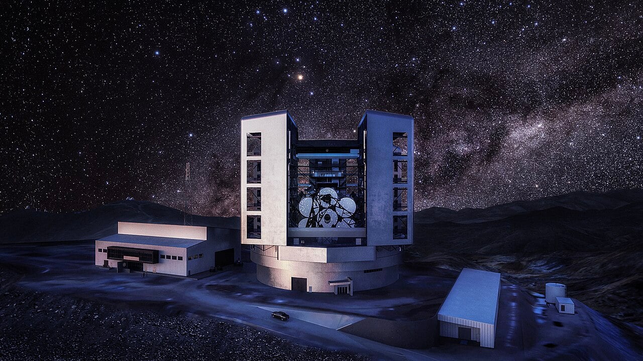 Nighttime exterior rendering of the Giant Magellan Telescope with support site buildings in the foreground at Las Campanas Observatory in the Chile Atacama Desert (Credit : Giant Magellan Telescope)