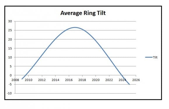 The average tilt (in degrees) of Saturn's ring system as seen from Earth spanning 2008-2026. (Graph created by author).[/caption]