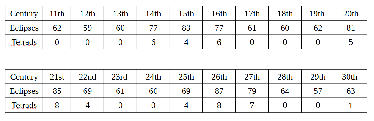 Note that over a five millennium span from 1999 BC to 3000 AD, the max number of eclipse tetrads that any century can have is 8, which occurs this century and last happened in the 9th century AD.