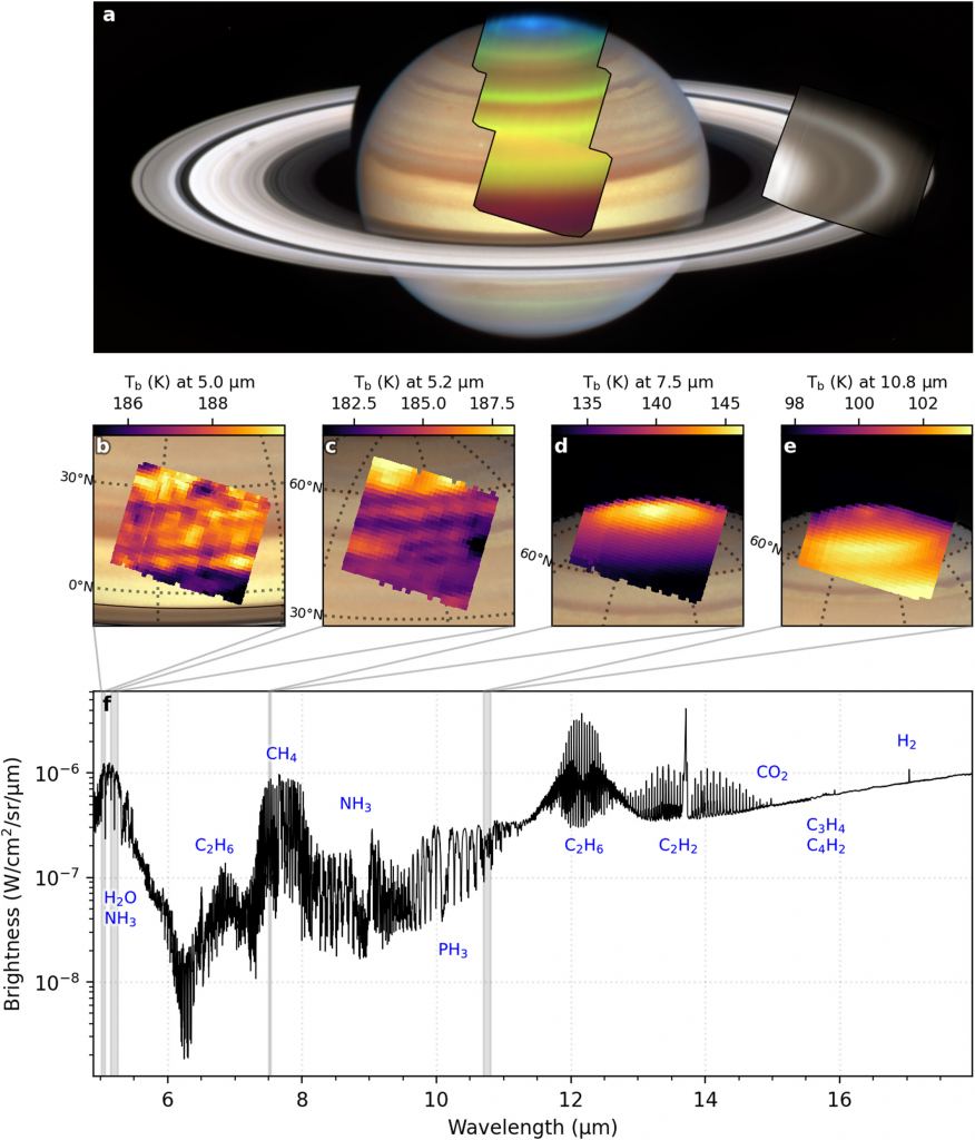 The unique image shows spectroscopic views from the Mid-Infrared Instrument (MIRI) showing Saturn's waning summer hemisphere, helping researchers to study the seasonal evolution of temperatures, aerosols, and composition.