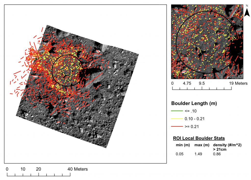 When the OSIRIS-REx sample return mission was being planned, NASA envisioned a site with a diameter of 50 meters (164 ft.) Nightingale's crater is bigger than that, but there are still risks. The size of the safe touchdown area in the crater is only about 16 meters (52 ft.) in diameter. That's only one tenth the size outlined in the mission plan.