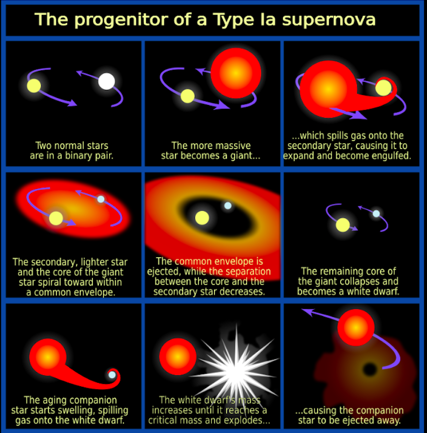 Type Ia supernovae occur when the dense, burnt out cores of dead stars (white dwarfs) explode in a spectacular thermonuclear detonation. The exact trigger mechanism has been debated for decades, but the SNIP identification points toward what's called the core degenerate scenario. In this model, a white dwarf spirals into the envelope of a companion star and merges with its core. The explosion happens later, but still within the timeframe when the planetary nebula from the earlier stellar interaction remains visible.