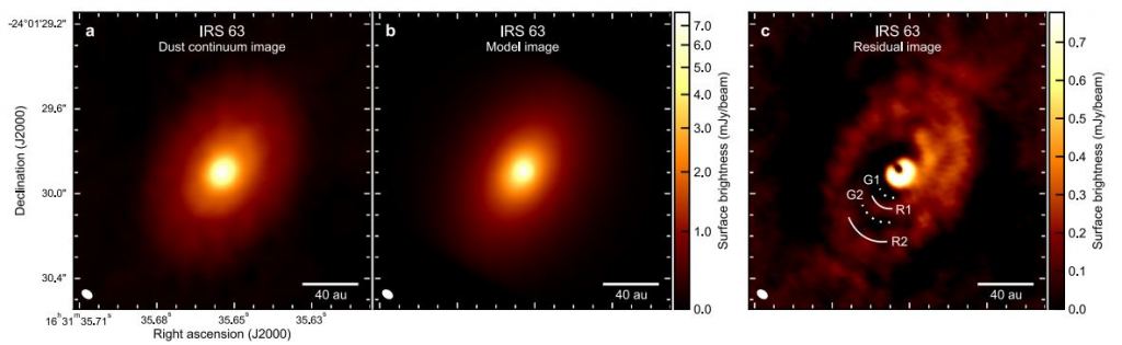The picture above is of protostar IRS 63 as imaged by ALMA (Atacama Large Millimeter/Submillimeter Array). ALMA can peer through the dusty shroud of the circumstellar disk surrounding the star system. IRS 63 is located 144 parsecs from Earth (about 470 light years) with a disk radius of 82AU (astronomical units or the average Earth-Sun distance of 150 million km). While we've identified even younger protostars, their disks are oriented edge on or at near-edge on angles such that it's difficult to observe their features. From our vantage point, IRS 63 is tilted toward us at 45 degrees offering a view of the early stages of a solar system's formation. To enhance the contrast and detail of the image, a computer model of IRS 63 was created that was "smooth" as if dust and gas had accumulated around the star without any disturbances – a "perfect" disk. This computer model was then subtracted from the actual image enhancing the differences between the real disk and simulated disk.