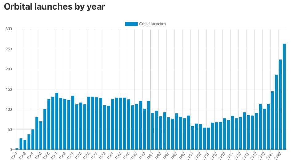 The launch of a rocket into orbit should never become routine. There was a time, probably around the 50's and 60's that a rocket launch hit the headlines. Now its just another launch. Last year (2024) saw a record breaking 263 launches. The US launched 158, China launched 68 and other countries/regions like Europe, Russian and Japan. Last year just 224 launches were completed and two years ago in 2022, 168 launches were completed. Surprisingly perhaps, prior to 2020 the record was set at 141 back in 1967, the future of rocket flight still seems quite alive!