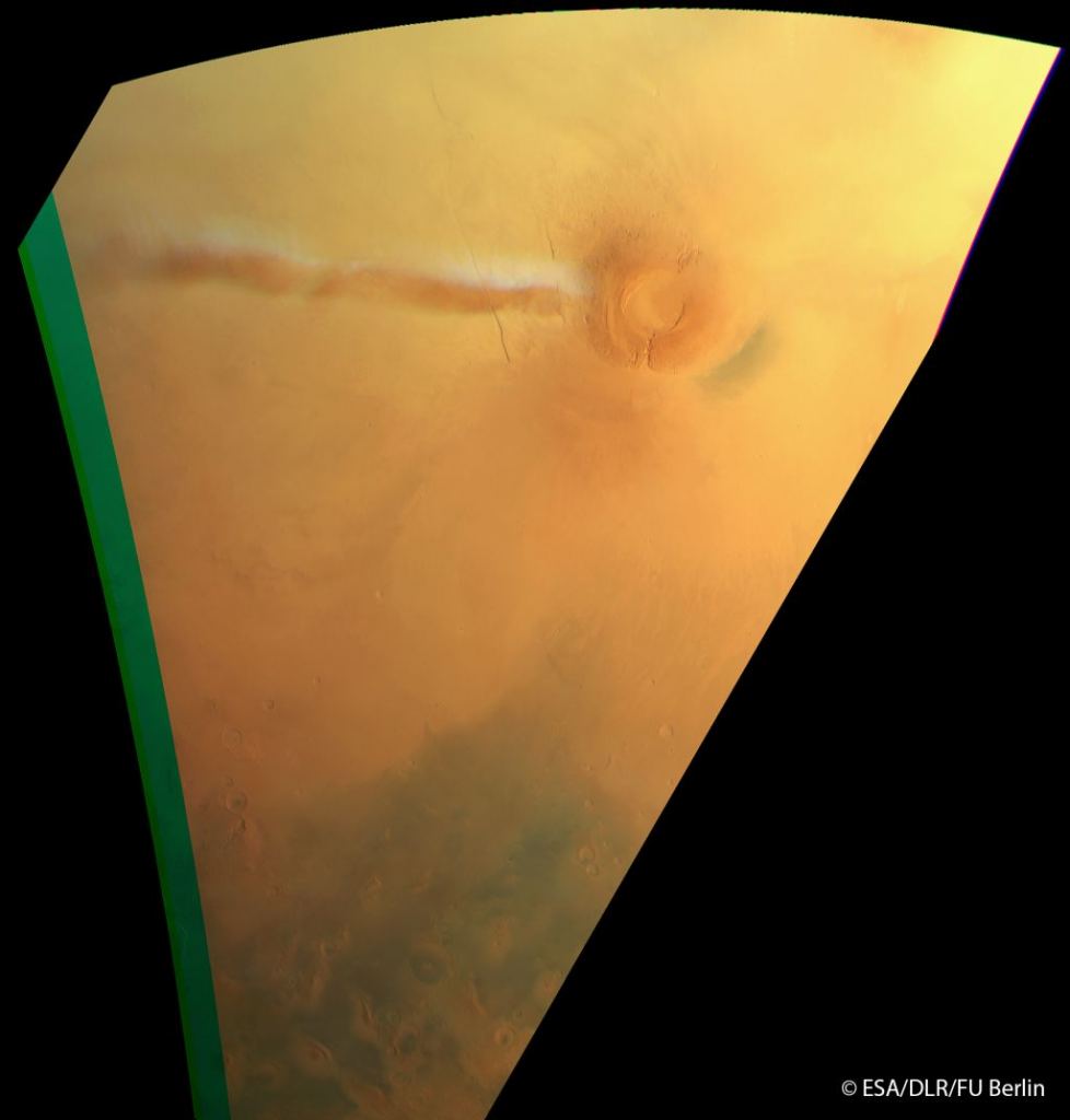This water ice cloud, which arises as the volcano slope interacts with the air flow, can be seen as the long white feature extending to the lower right of the volcano. The cloud, which measures 915 km in this view, also casts a shadow on the surface. This image was taken on 21 September 2018 from an altitude of about 6930 km. North is up. Image Credit: ESA/DLR/FU Berlin http://www.esa.int/spaceinimages/ESA_Multimedia/Copyright_Notice_Images[/caption]