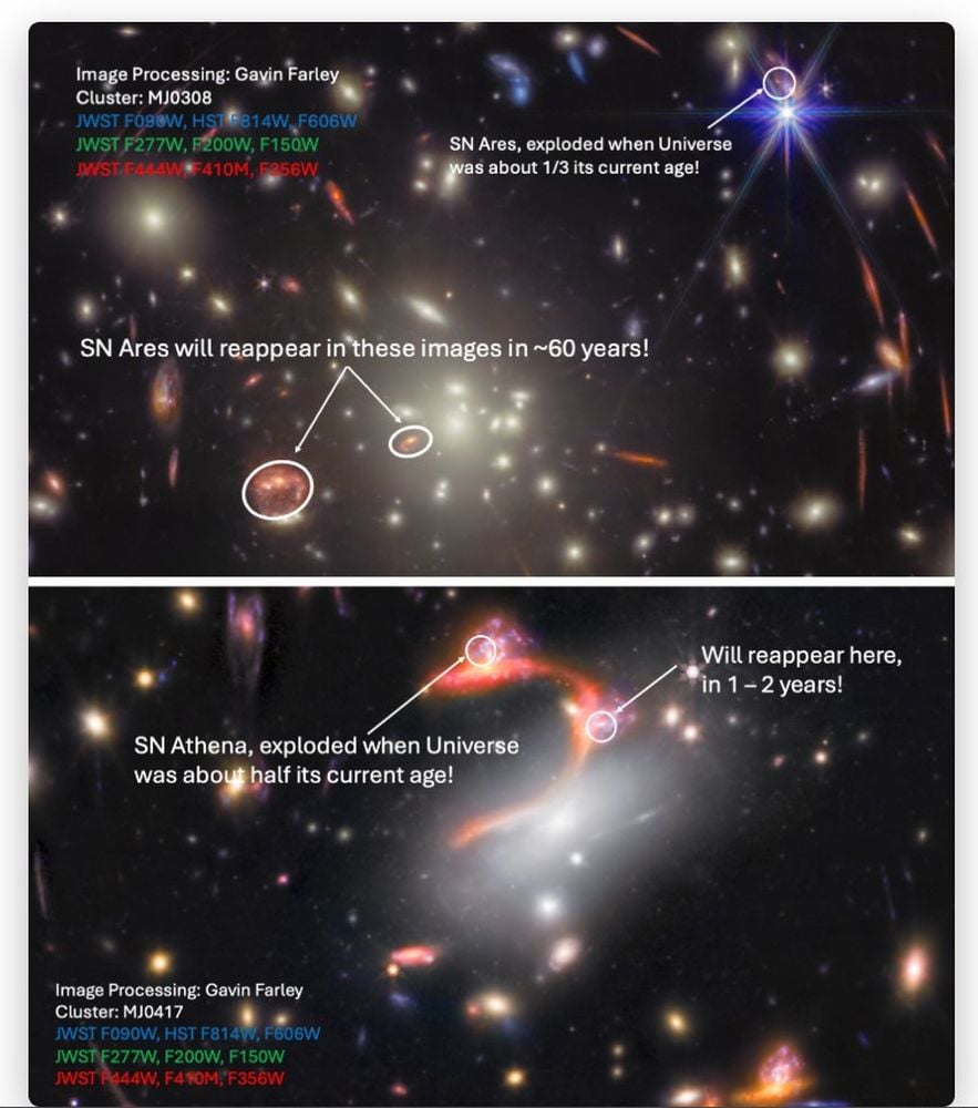 *These color images are composed of Hubble Space Telescope (HST) and James Webb Space Telescope (JWST) observations of the MJ0308 and MJ0417 galaxy clusters in which SN Ares and SN Athena were discovered, respectively. Both SNe will reappear in other lensed images years or decades from now, allowing for precise constraints on the expansion rate of the Universe. Image Credit: VENUS/Larison. Image Processing: Gavin Farley*