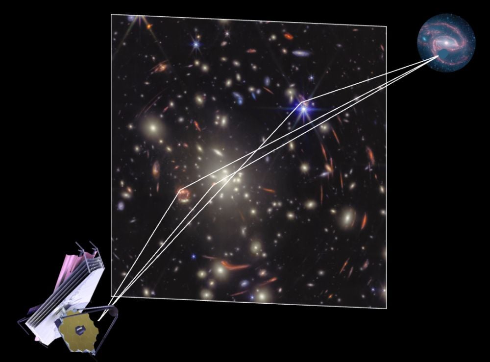 This image illustrates the gravitational lensing effect. As light from ancient, distant supernovae travel past massive galaxy clusters, the light is bent and split. As long as the supernovae and clusters are lined up from our perspective, the JWST can take advantage. This image shows light from the ancient supernova Ares being warped and split into multiple images by the MJ0308 galaxy cluster. Image Credit: