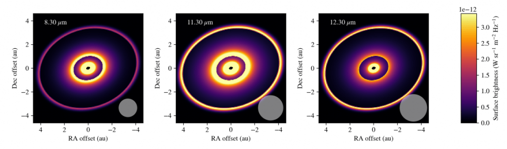 "Our best-fit model has three disk zones with ring-like structures at 0.15, 1.3, and 4.1 au.," the authors write in their research. This means the structure contains two gaps, at about 0.9 au and about 3 au. These gaps are carved out by still-forming rocky planets, according to the authors. "Assuming that the dark regions in the disk at ~0.9 au and at ~3 au are gaps opened by planets, we estimate the masses of the putative gap-opening planets to be around a Jupiter mass."