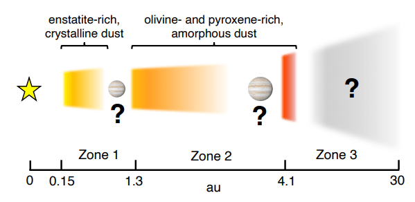 The region close to the star is much hotter than more distant regions, obviously. The heat provides further confirmation of these results. In the hot environment close to the star, where the temperature reaches 1500 C, iron and minerals melt and often recondense as crystals. Conversely, carbon can't survive the high temperatures. It would be vapourized and form carbon monoxide or carbon dioxide gas.