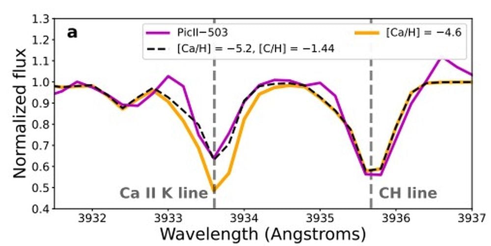 This figure illustrate's some of PicII-503's metallicity. It provides "Spectroscopic confirmation of PicII-503 as an ultra metal-poor, carbon-enhanced star," the authors write. "The Ca II K feature is typically the strongest metal line in stars, and is barely detected for PicII-503. The adjacent absorption feature is an otherwise weak carbon line that appears due to the high carbon abundance of the star." Image Credit: Chiti et al. 2026. NatAstr.