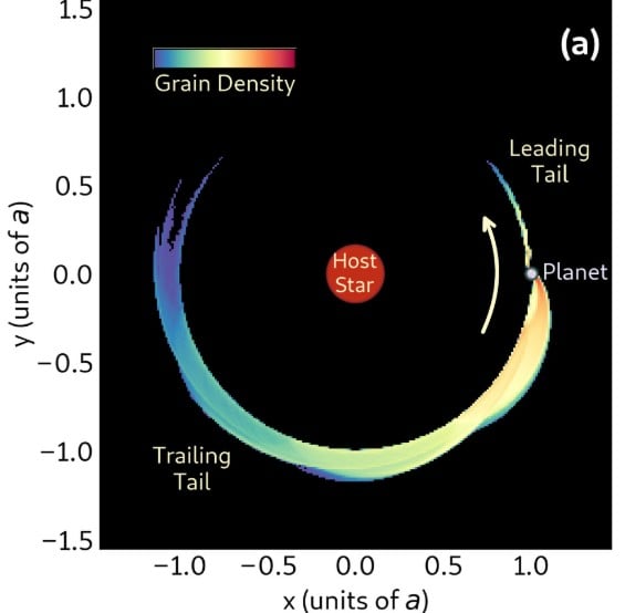 The researchers ran simulations to visualize the dust trails. They simulated the release of 50,000 dust grains in random directions, mimicking the loss of material from the exoplanet. "We assumed a nominal planet with a mass of 0.02 Earth masses and a radius of 2000 km that is orbiting a 0.7 solar mass host star," the researchers wrote in their paper. They ran the simulation for 30 planetary orbits, eliminating any grains that fell back onto the planet.