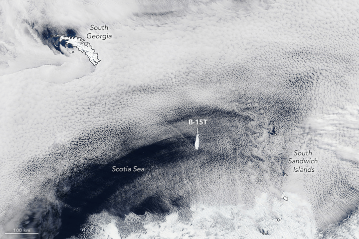 This image of iceberg B15-T was captured by the MODIS instrument on NASA's Terra satellite. Image Credit: Lauren Dauphin and Jeff Schmaltz, using MODIS data from NASA EOSDIS/LANCE and GIBS/Worldview.[/caption]