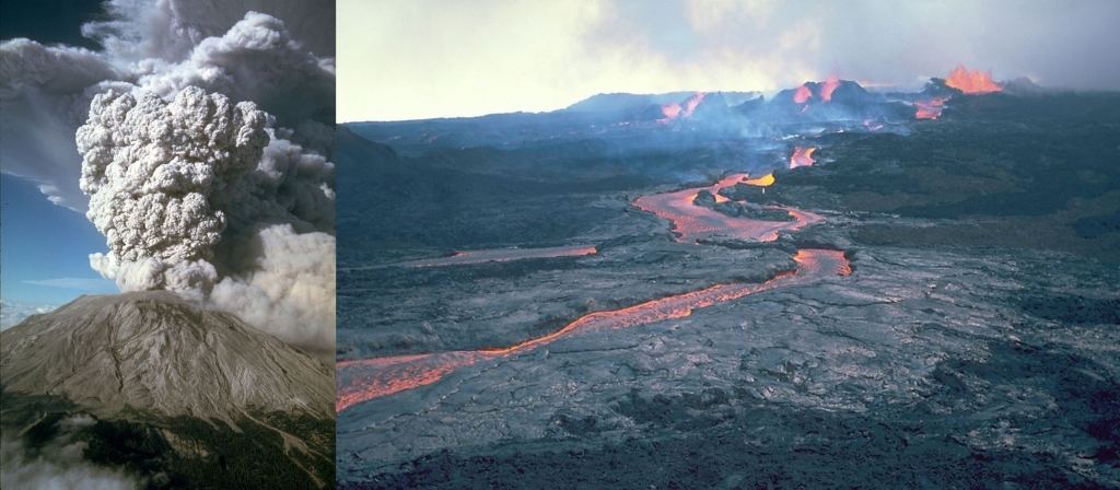 Two types of eruptions. On the left is the Mt. St. Helens explosive eruption in 1980. On the right is the effusive eruption from Mauna Loa, Hawaii, in 1984. Image Credit: (Left; By Mike Doukas - USGS Cascades Volcano Observatory, Public Domain, https://commons.wikimedia.org/w/index.php?curid=680506. Right: By Photo by R.W. Decker. - http://hvo.wr.usgs.gov/gallery/maunaloa/1984/2441061_caption.html, Public Domain, https://commons.wikimedia.org/w/index.php?curid=3157962)
