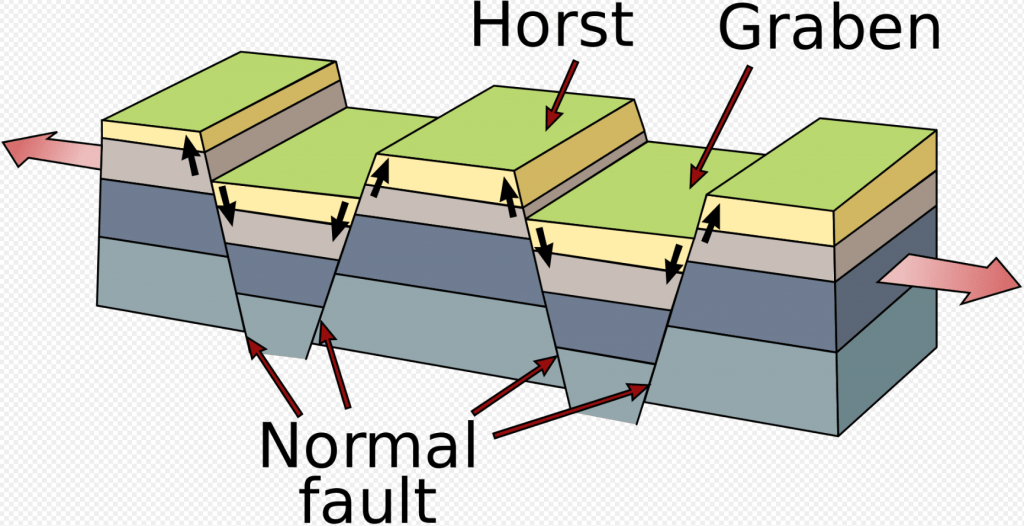 Grabens are valleys with sharp escarpments on both sides. Image Credit: By Horst_graben.jpg: U.S. Geological Surveyderivative work: Gregors (talk) 11:17, 7 June 2011 (UTC) - Horst_graben.jpg, Public Domain, https://commons.wikimedia.org/w/index.php?curid=15432947