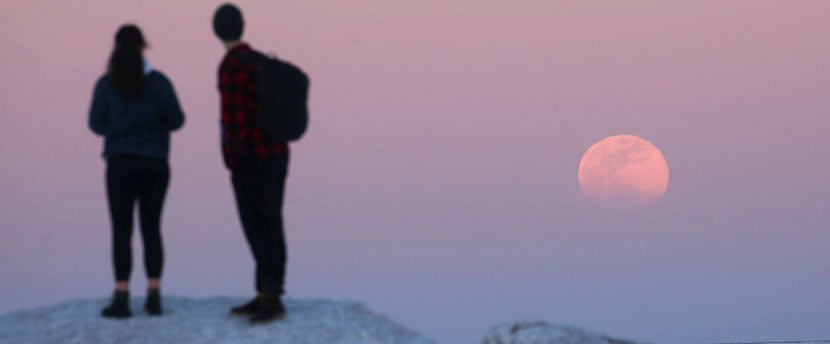 A couple watches the Moon rise from the icy shore of Lake Superior in Duluth earlier this month on March 1. Credit: Bob King[/caption]
