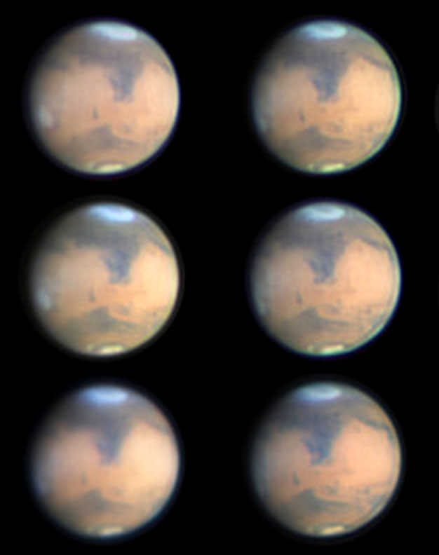 Mars at 1 a.m. CDT on successive nights starting March 21, 2014. Notice how planetary features appear to rotate slowly eastward night to night. Created with images from Meridian[/caption]