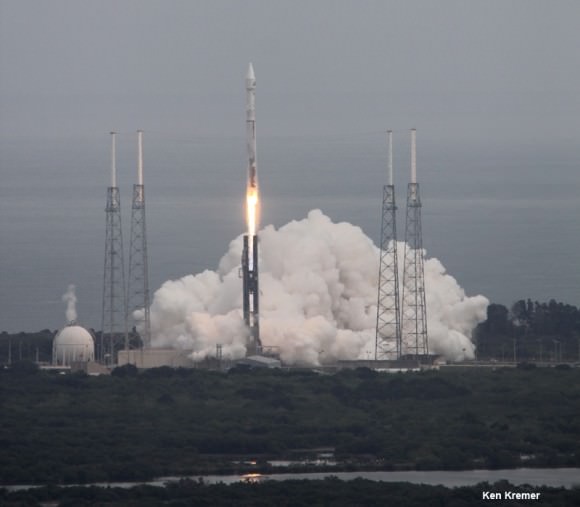 NASA's Mars bound MAVEN spacecraft launches atop Atlas V booster at 1:28 p.m. EST from Space Launch Complex 41 at Cape Canaveral Air Force Station on Nov. 18, 2013. Image taken from the roof of the Vehicle Assembly Building (VAB) at NASA's Kennedy Space Center. Credit: Ken Kremer/kenkremer.com[/caption]
