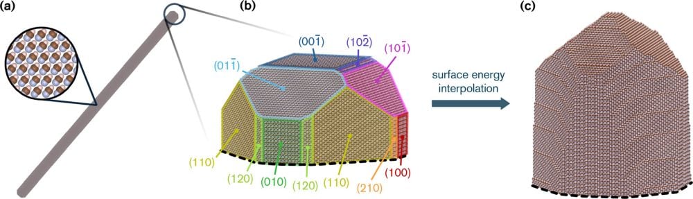 *This figure illustrates the faceted surface on the end of an HCN crystal. The ends have strong electric fields that can encourage catalysis. Image Credit: Cappelletti et al. 2025. ACS Central Science*