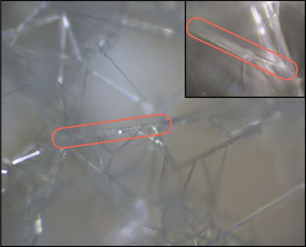 Microscope image of HCN crystals with 10× (full image) and 50× (top right inset) magnification. HCN crystallizes to high aspect-ratio needles (two are highlighted in red), which form a cobweb connectivity. Image Credit: NASA/JPL-Caltech.