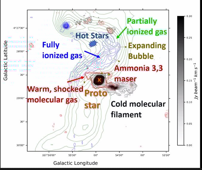 What can this protostar tell us about triggered star formation? For one thing, its location is a big hint. It lies directly at the intersection between one of those expanding HII bubbles made by the birth of nearby stars and a rich, dense filament in the body of the Nessie Nebula. The bubble contains high-energy stars and HII regions, along with the bright young protostar. The team looked specifically at the intersection of the bubble and the filament and found radio emissions from warm ammonia gas and silicon monoxide (SiO).
