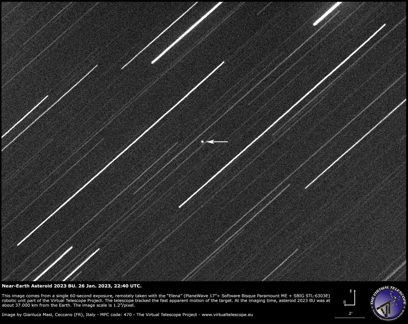 NASA said that after sufficient observations were collected, the Scout impact hazard assessment system was quickly able to determine that the asteroid's path would bring it close to Earth, but there was no danger of impact. Within three days, a number of observatories around the world had made dozens of observations, helping astronomers better refine 2023 BU's orbit.